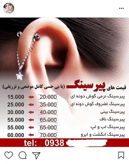بینی = 40 هزار تومان ،لب = 45هزار تومان ، ابروی حلقوی= 40 هزار تومان ،ابروی صاف= 35هزارتومان . زبان = 55 هزار تومان ، گوش = 15هزارتومان، ناف = 65 هزارتومان و ...!