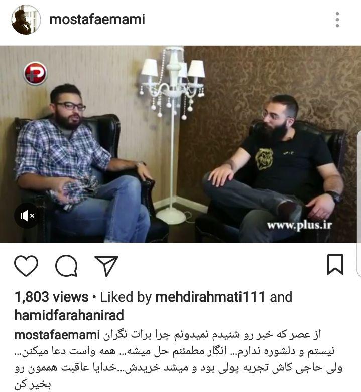 مصطفی امامی (مجری): از عصر که خبر رو شنیدم نمیدونم چرا برات نگران نیستم و دلشوره ندارم... انگار مطمئنم حل میشه... همه واست دعا میکنن... ولی حاجی کاش تجربه پولی بود و میشد خریدش...خدایا عاقبت هممون رو بخیر کن