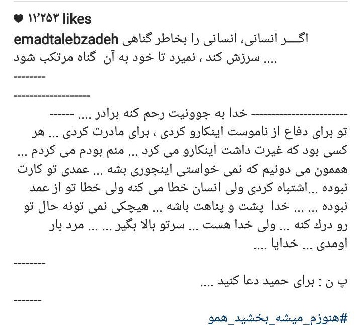 عماد طالب زاده(خواننده): اگــــر انسانی، انسانی را بخاطر گناهی سرزش کند ، نمیرد تا خود به آن گناه مرتکب شود ....