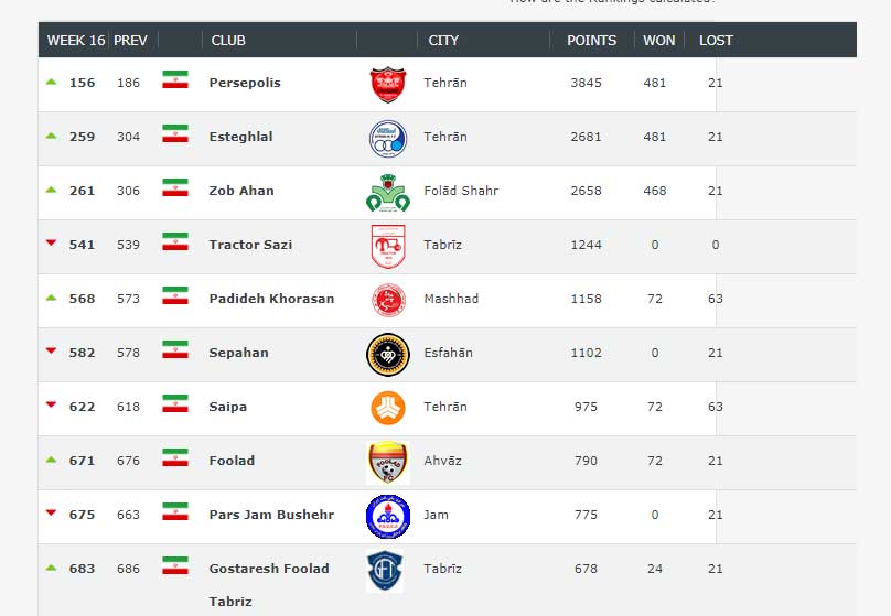 تیم‌های فوتبال پرسپولیس و استقلال به ترتیب در جایگاه ۱۵۶ و ۲۵۹ جهان قرار گرفتند.