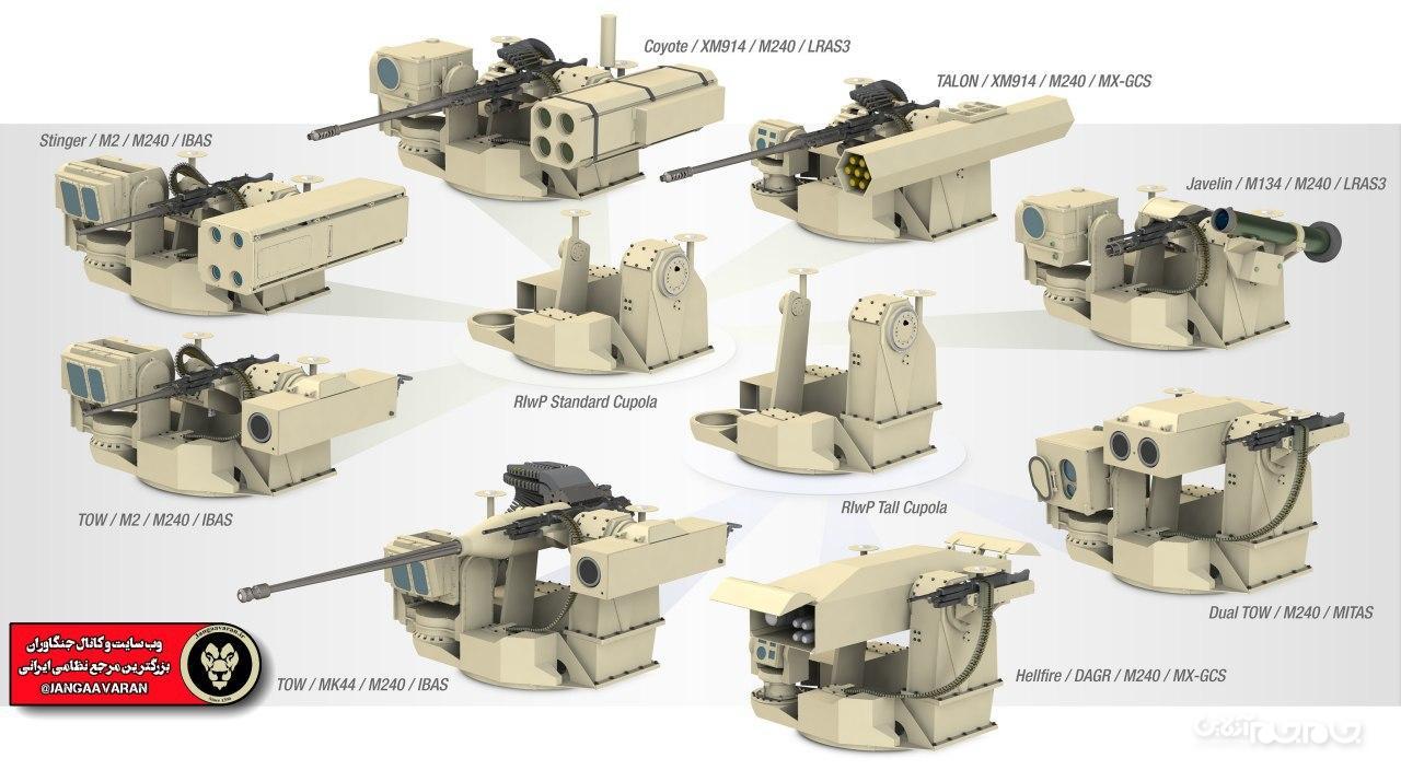 از جمله تسلیحاتی که بر روی این برجک نصب می شود می توان به توپ 30 م م، مسلسل 7.62 م م، راکت 70 م م، نارنجک انداز خودکار 40 م م، موشک ضدتانک جاولین، موشک ضدزره تاو  و موشک دفاع هوایی استینگر اشاره کرد؛ البته نوع تسلیحات استفاده شده به کاربرد عملیات مدنظر بستگی دارد.