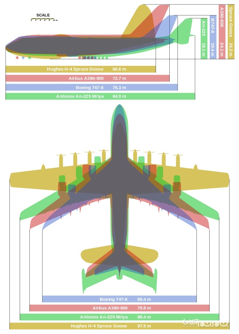 مقایسه ای ابعاد 4 نمونه از بزرگترین هواپیماهای جهان
