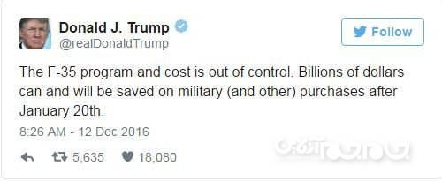 جام جم آنلاین به نقل از دیجیاتو، دونالد ترامپ رییس جمهور منتخب آمریکا در سال 95 گفته بود که هزینه ساخت جنگنده های F-35 از کنترل خارج شده است.