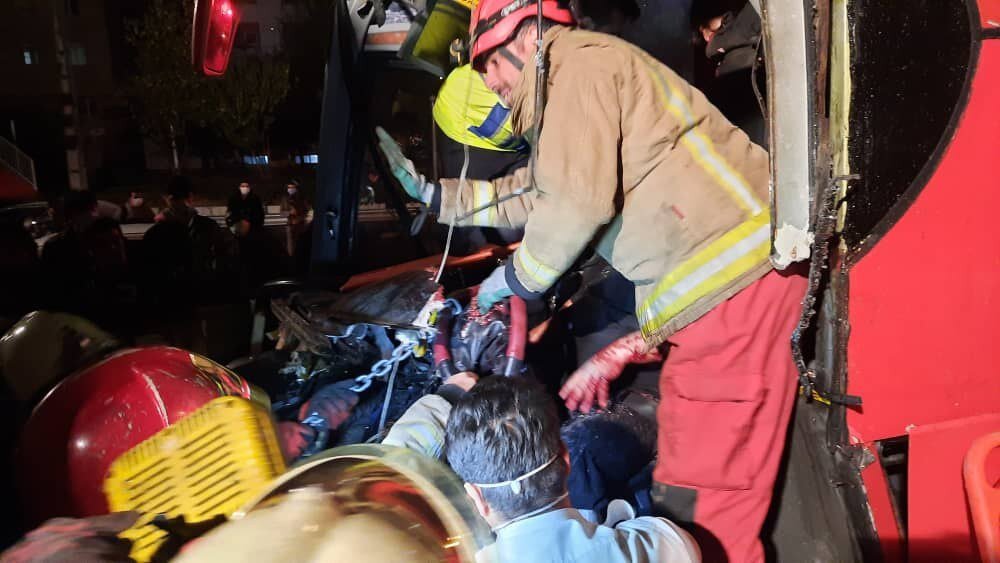 ملکی گفت: راننده و شاگرد راننده اتوبوسی که مسافران بیشتری داشت پشت قسمت داشبورد و فرمان محبوس شده بودند که آتش نشانان با تجهیزات هیدرولیکی قطعات اتوبوس را برش داده و این دو فرد را خارج میکنند.