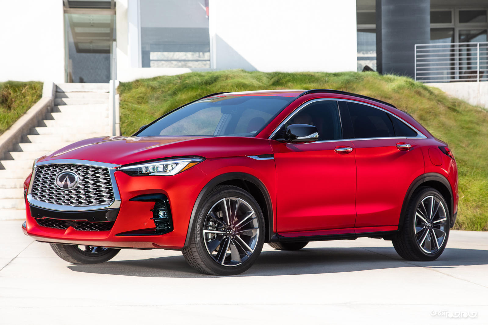 در نمای روبهرو تفاوت چندانی بین QX55 و QX50 دیده نمیشود. صرفا چیدمان نوار LED روشنایی روز داخل چراغهای جلو تغییر کرده است و کمی افزایش حجم در اندازه جلوپنجره وجود دارد تا مدل کوپه، اسپرتتر به نظر رسد. برخلاف بسیاری از شاسیبلندهای مدرن بازار جهانی، QX55 مجهز به مهشکنهای دایرهای در طرفین سپر است. حساسیت در نصب ادوات سیاهرنگ پلاستیکی و استفاده از قطعات براق کروم در جلوپنجره، دستگیرهها و قاب پنجره از نکات مثبت در QX55 هستند.