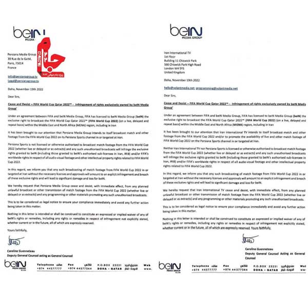 شبکه Persiana Sports مجوز ( license ) نداشته و یا به نحوی دیگر مجاز به پخش تصاویر مسابقات جام جهانی فوتبال 2022 (چه به صورت زنده یا با تاخیر یا به صورت گزیده) نمی باشد و هرگونه پخش غیرمجاز حقوق انحصاری اعطا شده به beIN از جمله مواردی که به beIN اعطا شده است را نقض می کند و از جمله حقوقی که به دارنده مجوز فرعی در ایران، صدا و سیما(و/یا حقوق جهانی فیفا در رابطه با کلیه فیلم های سمعی و بصری و سایر حقوق مالکیت معنوی مربوط به جام جهانی 2022 نقض می کند.