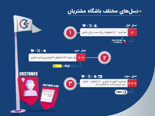 حدود نیم قرن پیش مجموعههایی با عنوان باشگاه مشتریان یا باشگاه تخفیفی در اروپا تاسیس شد. مهمترین ویژگی این باشگاهها تفاوت در ارائه سرویس، وفادارسازی مشتریان، افزایش قدرت خرید اعضا و رونق بیشتر کسب و کارها بود. در چند سال اخیر نیز تعدادی باشگاه مشتریان در ایران تاسیس و شروع به فعالیت نمودند. این باشگاهها باید بتوانند با ایجاد آگاهی کامل و روشهای متنوع به مشتریها حس احترام و صمیمیت را انتقال دهند، بهطوری که آنها پیگیر کسب و کارهای عضو باشگاه شوند و البته از منافع بیشتری نیز برخوردار گردند. مسیر رشد و توسعه این باشگاهها از ابتدا تا به امروز در قالب سه نسل قابل معرفی هستند: