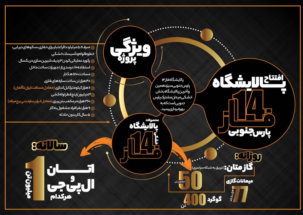 محمدحسین متجلی، مدیرعامل شرکت نفت و گاز پارس، درباره ویژگیهای این طرح میگوید: بیش از 70 درصد از طراحی و ساخت فاز 14 داخلی است و به عنوان ایرانیترین پالایشگاه شناخته شده است. فاز 14 پارس جنوبی بهعنوان آخرین پالایشگاه بخش خشکی در میدان مشترک گازی پارس جنوبی شناخته میشود. این فاز 44 حلقه چاه دارد که گاز تولیدی از آن با استفاده از دو خط لوله دریایی به طول 210 کیلومتر به سمت پالایشگاه فاز 14 منتقل میشود.