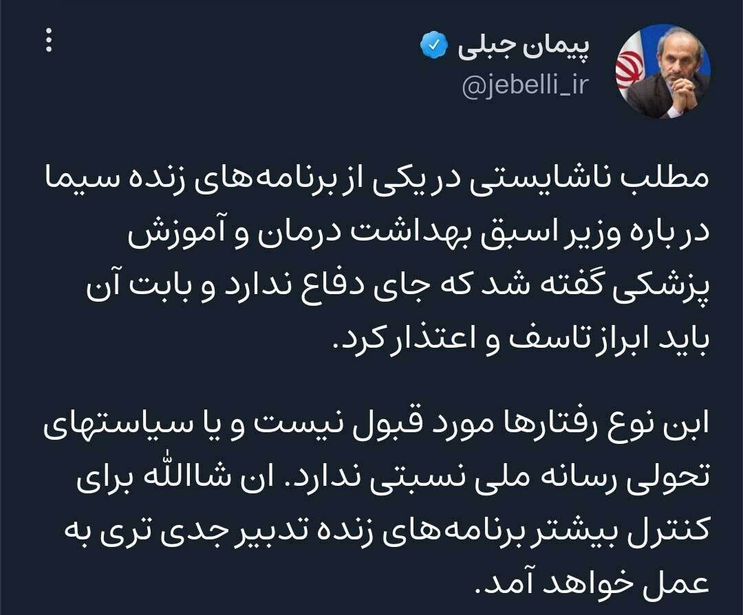 واکنش دکتر پیمان جبلی، رئیس سازمان صداوسیما به رفتار مجری شبکه پنج: جای دفاع ندارد و مورد قبول نیست.