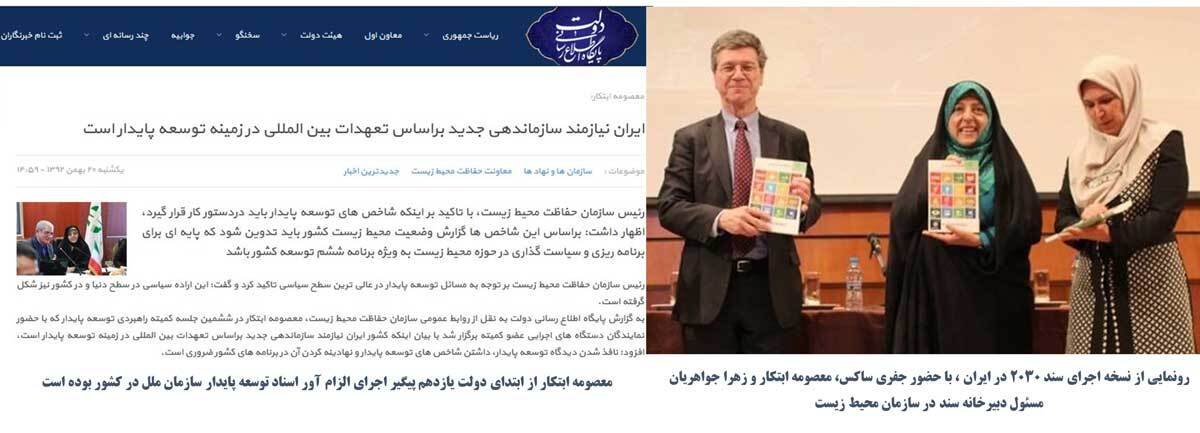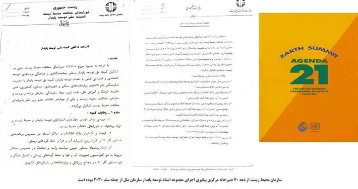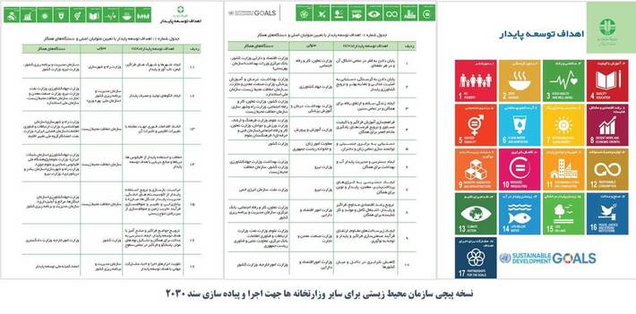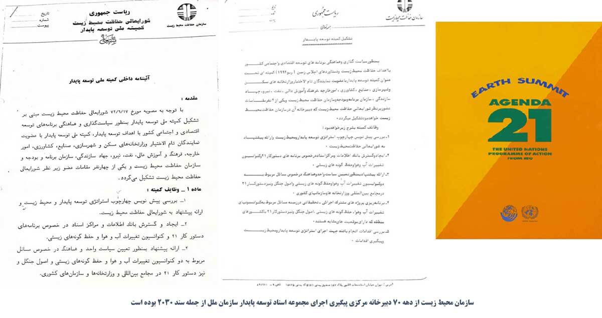 پس از تصویب سند دستورالعمل ۲۱ در سال ۱۹۹۲ میلادی، در سازمان حفاظت از محیط زیست کمیتهای تحت عنوان توسعه پایدار با حضور نمایندگانی از ۱۱ نهاد و وزارتخانه دیگر تشکیل و از آن سال دبیرخانه کشوری پیگیری کننده اسناد توسعه پایدار سازمان ملل در سازمان محیط زیست مستقر میشود، پس از تصویب سند ۲۰۳۰ هم بلافاصله این سند توسط دفتر توسعه پایدار سازمان محیط زیست به ریاست خانم «زهرا جواهریان» ترجمه و در داخل کشور منتشر میشود و در آن متولی اجرای اجزاء مختلف سند ۲۰۳۰ در کشور را معین میکند؛ همزمان با این موضوع در خردادماه ۱۳۹۵خانم ابتکار رئیس وقت سازمان محیط زیست میزبان «جفری ساکس» دستیار ارشد دبیرکل سازمان ملل در رابطه با سند ۲۰۳۰ میشود.