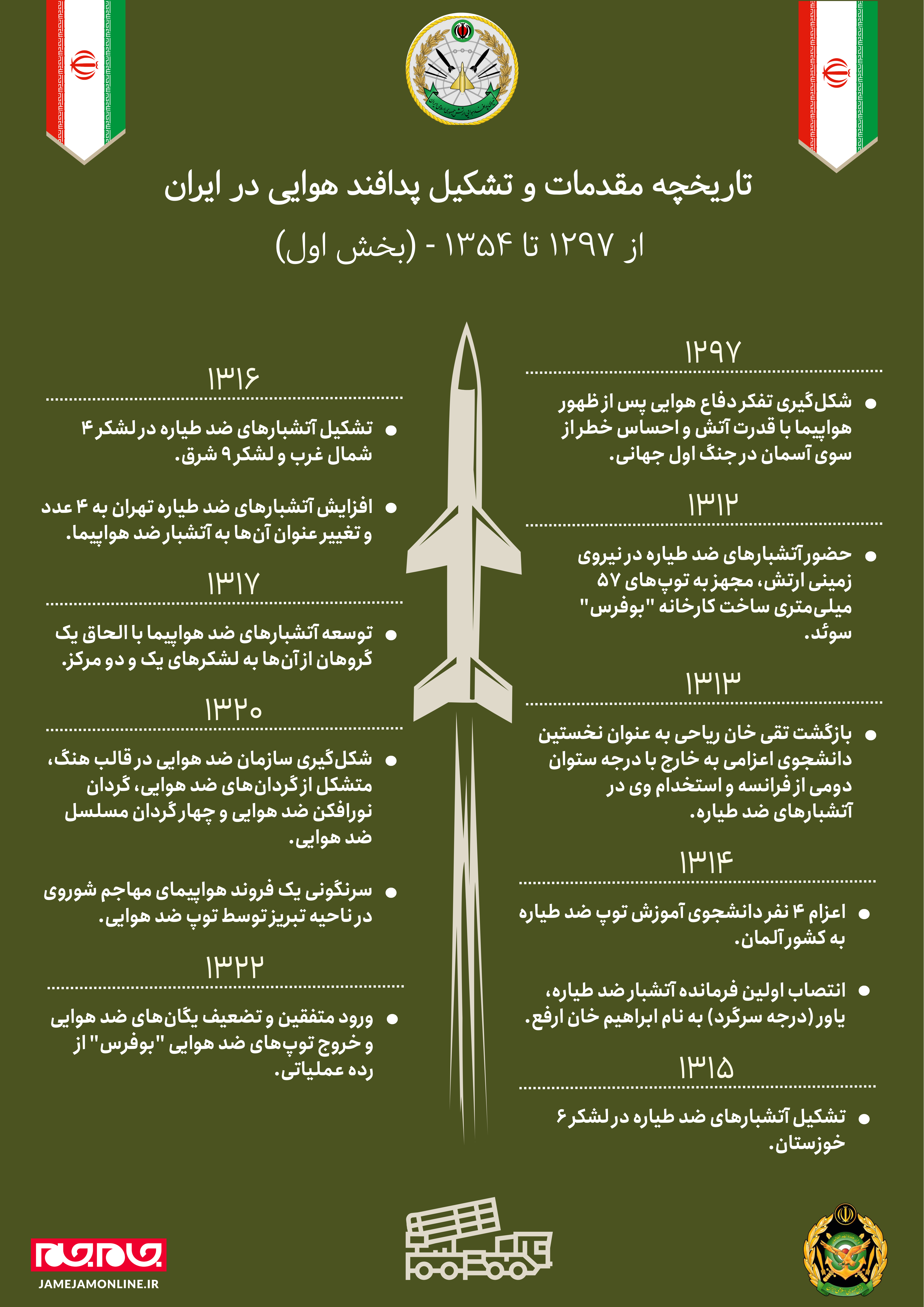 1312: حضور آتشبارهاي ضدطياره در نيروي زميني ارتش مجهز به توپهاي 57 ميليمتري ساخت كارخانه "بوفرس" سوئد.