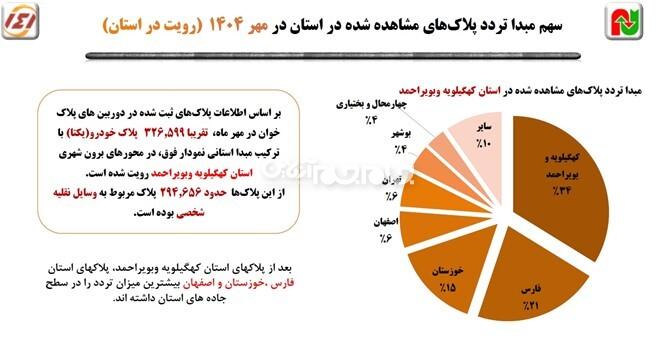 پیمانجو در ادامه گفت: بر اساس داده های سامانه های پلاک خوان، سهم تردد وسایل نقلیه غیر بومی در استان در مهر ماه نسبت به ماه قبل ۱۰% کاهش داشته و همچنین بعد از پلاکهای استان کهگیلویه وبویراحمد، پلاکهای استان فارس،خوزستان و اصفهان بیشترین میزان تردد را در سطح جاده های استان داشته اند. بر اساس داده های مذکور پلاک های استان کهگیلویه و بویراحمد بیشترین مقصد سفر را در استانهای فارس، خوزستان و اصفهان داشته اند.
