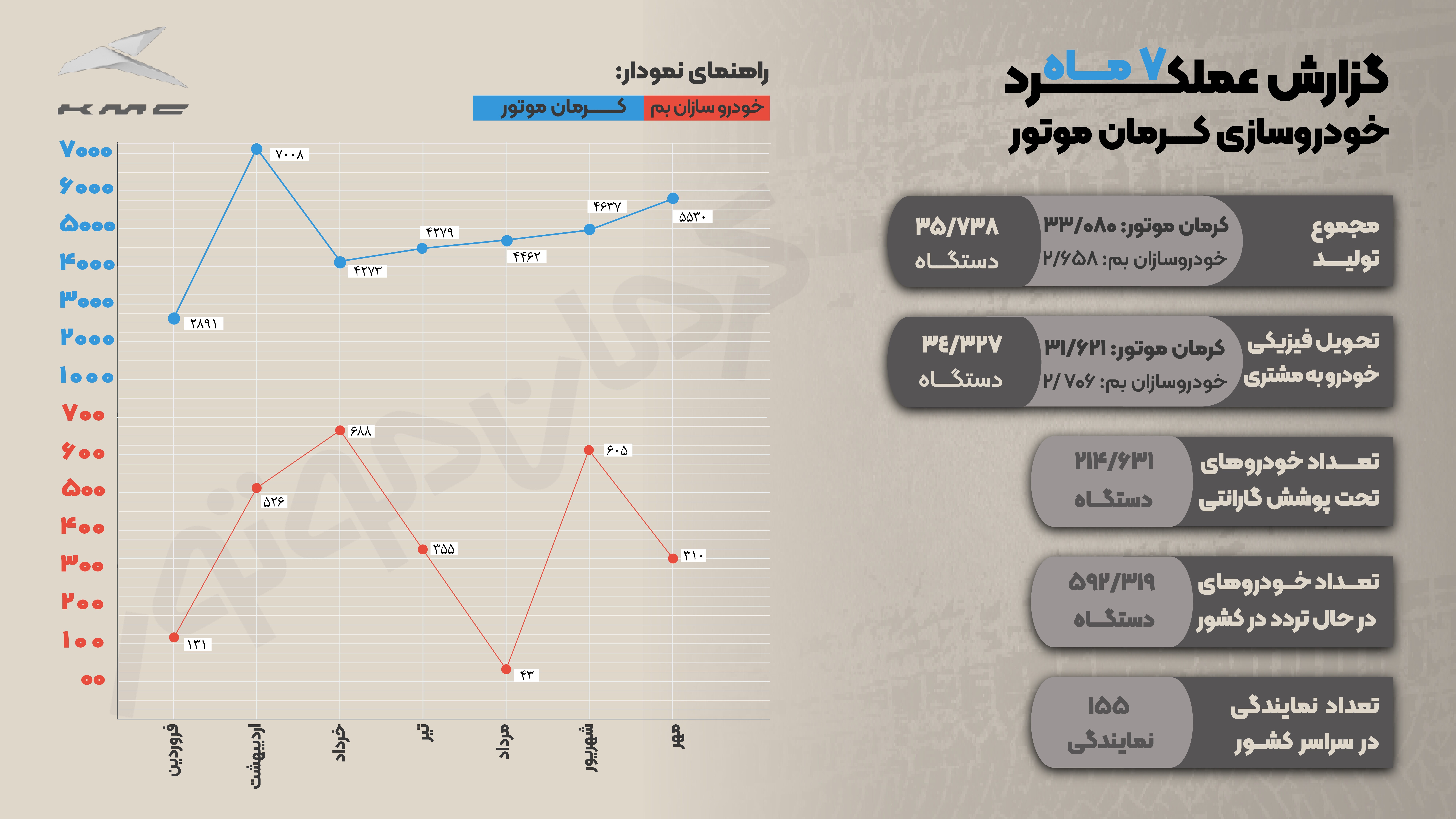 بر اساس آمار منتشر شده از سوی وزارت صمت، تولید کرمان موتور در هفت ماهه نخست سال جاری از مرز 35 هزار دستگاه عبور کرده است.