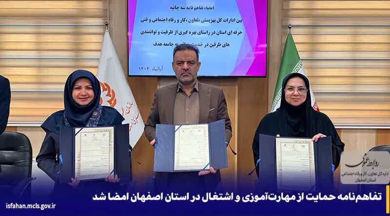 جام جم آنلاین اصفهان؛ در تاریخ ۲۵ آبان ماه ۱۴۰۴، تفاهمنامه همکاری سهجانبهای با هدف ایجاد اشتغال پایدار و توانمندسازی اقشار نیازمند و توانخواهان تحت پوشش بهزیستی استان اصفهان منعقد شد. این تفاهمنامه به نمایندگی فریده روشن از اداره کل آموزش فنی و حرفهای، رضا برزوئیان از اداره کل تعاون، کار و رفاه اجتماعی و سمیه کریمی از اداره کل بهزیستی استان امضا شد.