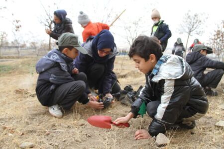 کاشت نهال توسط دانش‌آموزان همدانی در محوطه کتابخانه‌های عمومی استان