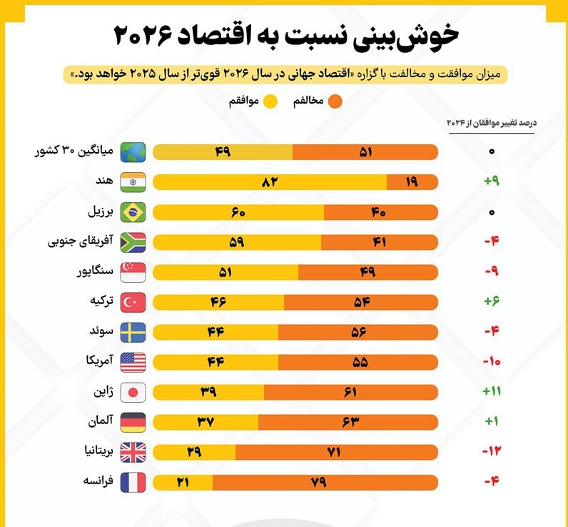 ​​​​​​​نگاه جهانی به اقتصاد محتاطانه و حتی بدبینانه است؛ تنها ۴۹درصد به بهبود اقتصاد جهانی در سال ۲۰۲۶ امیدوارند. درعین‌حال، نگرانی از بی‌ثباتی به اوج رسیده: ۵۹ درصد، احتمال اعتراض‌های گسترده را زیاد می‌دانند و پیش‌بینی حدود نیمی از مردم رکود اقتصادی یا کاهش امنیت منطقه‌ای است. به‌طور کلی، جهان در آغاز سال ۲۰۲۶ در تعادلی شکننده میان امید اندک و اضطراب فراگیر قرار دارد.