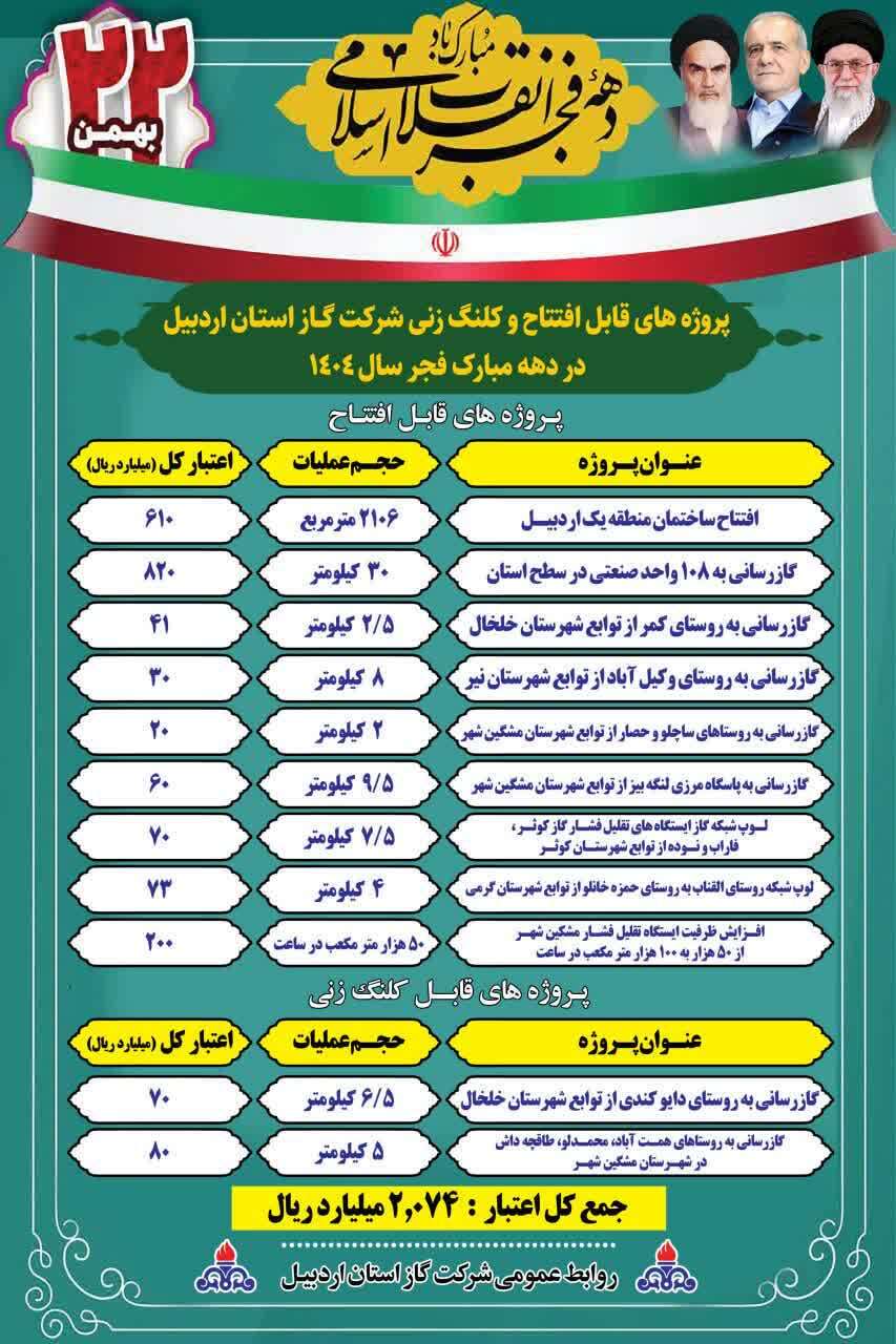 مدیرعامل شرکت گاز استان اردبیل گفت: این پروژهها شامل گازرسانی به ۱۰۸ واحد صنعتی گازرسانی به روستاهای کمر در شهرستان خلخال، روستاهای وکیل آباد در شهرستان نیر، روستای ساچلو و حصار در شهرستان مشکین شهر و گازرسانی به پاسگاه مرزی لنگه بیز خواهد بود. خدابنده افزود: افتتاحیه ساختمان منطقه یک اردبیل، افزایش ظرفیت ایستگاه تقلیل فشار مشگین شهر از ۵۰ هزار به ۱۰۰ هزار متر مکعب در ساعت و لوپ شبکه گاز ایستگاههای تقلیل فشار گاز کوثر، فاراب، نوده از توابع شهرستان کوثر و لوپ شبکه گاز روستای القناب به روستای حمزه خانلو از توابع شهرستان گرمی از دیگر پروژههای قابل افتتاح در این ایام خواهد بود. وي هنچنین از آغاز عملیات گازرسانی به روستای دایو کندی در شهرستان خلخال و روستاهای همت آباد، محمدلو و طاقچه داش از توابع شهرستان مشگین شهر خبر داد. مدیرعامل شرکت گاز استان اردبیل میزان اعتبار هزینه شده برای پروژه های قابل افتتاح و اعتبار پیش بینی شده برای آغاز عملیات اجرایی پروژهها را ۲ هزار و ۷۴ میلیارد ریال اعلام کرد.