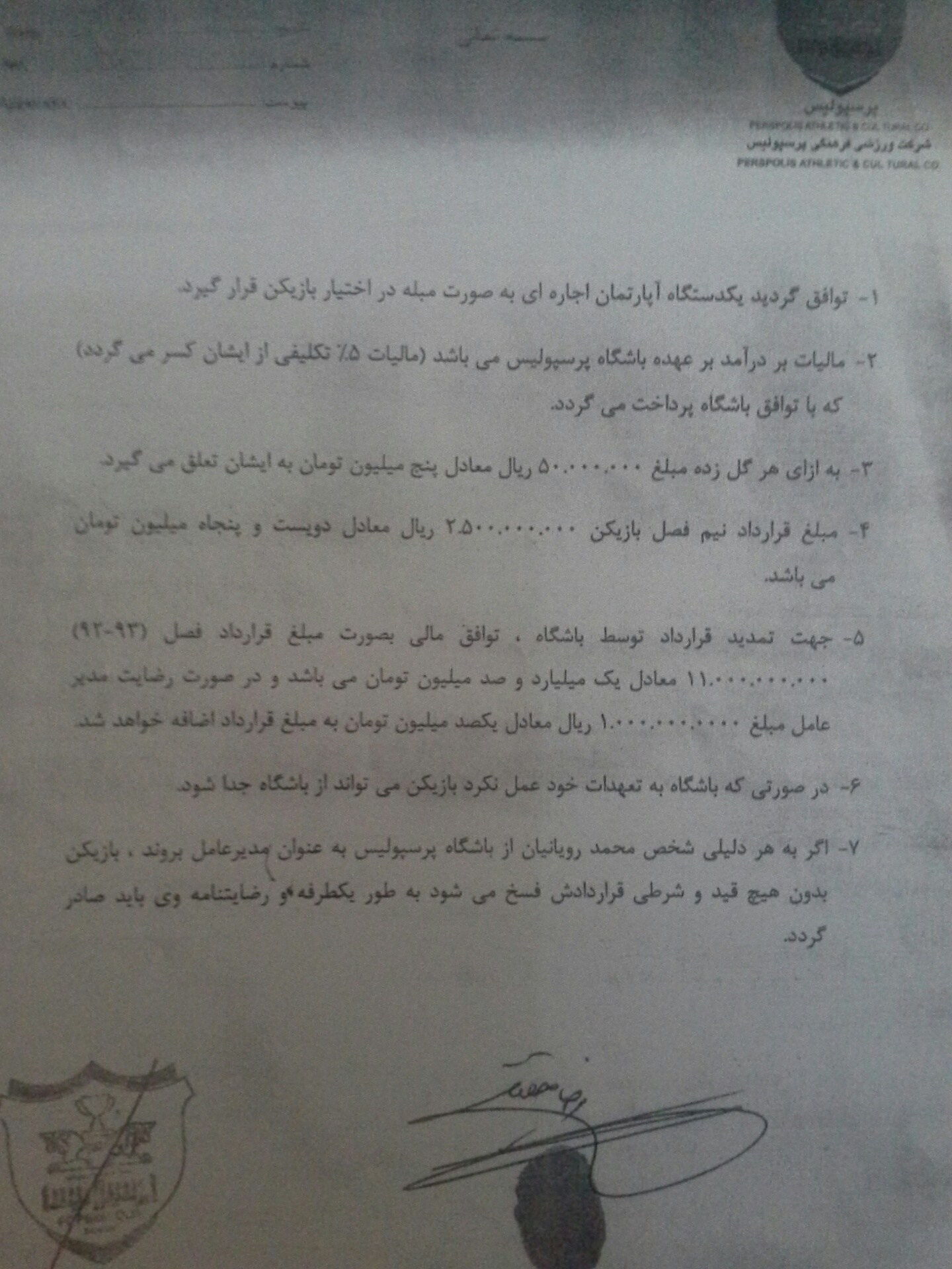 در این دادنامه آمده که چون وفق ماده 11 قرارداد های رسمی ثبت شده نزد سازمان لیگ، طرفین پذیرفته اند که قرارداد داخلی اعتباری ندارد فلذا این بازیکن باید به قراردادش با پرسپولیس پایبند باشد و نمی تواند بدون جلب رضایت آنها از این باشگاه جدا شود.