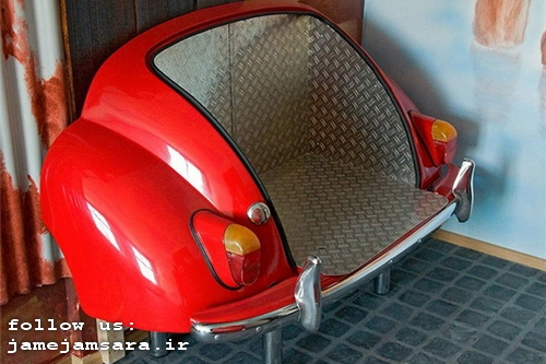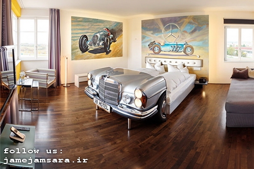 جام جم سرا: ساختار جلوی تختها، صندلیها، اتاقها، دیوارها و بخشهای گوناگون این هتل با موتورسیکلت و قسمتهای مختلف خودرو تزئین شده است.