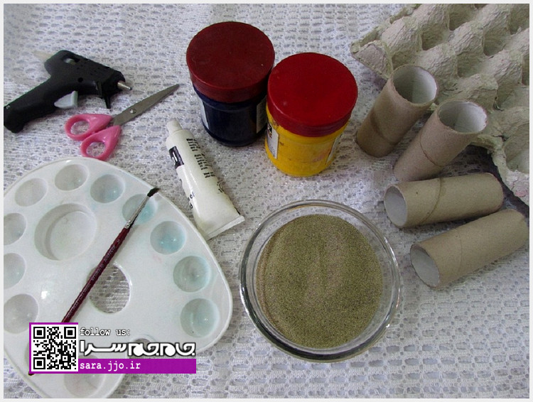 رول دستمال کاغذی، شانه تخم‌مرغ، نصف کاسه شن یا ماسه بادی یا پوست تخم‌مرغ خردشده، رنگ گواش، چسب چوب یا سریش، چسب حرارتی، آب، قیچی، قلم مو، پالت رنگ.