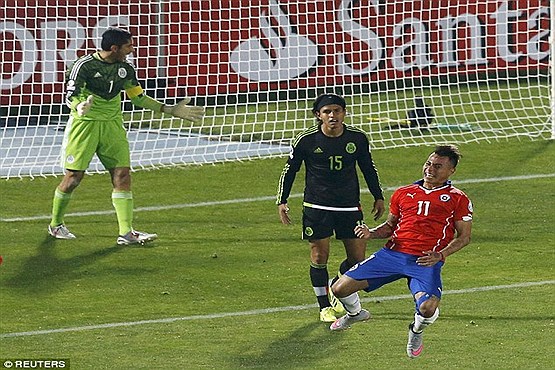 ماتیاس ووسو ابتدا در دقیقه ۲۱ تیم مکزیک را پیش انداخت اما تنها پس از گذشت یک دقیقه، ویدال بازی را به تساوی کشید. رائول خیمنس در دقیقه ۲۹ تیم مکزیک را پیش انداخت اما در دقیقه ۴۲ ادواردو وارگاس گل دوم شیلی را وارد دروازه مکزیک کرد تا بازی در نیمه نخست با تساوی به پایان برسد.