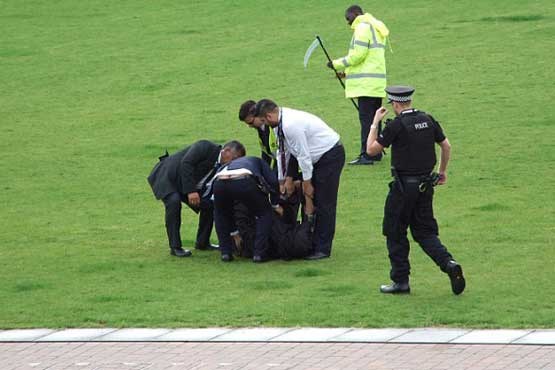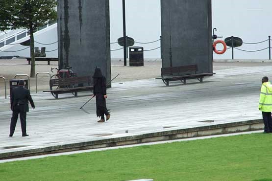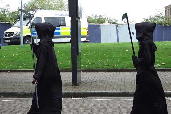 به گزارش جام جم آنلاین، روز گذشته، مردی در اعتراض به برگزاری نمایشگاه تسلیحات نظامی در لندن خود را به شکل نماد مرگ در اسطوره های اروپایی درآورد تا با ظاهر ترسناکش مانع وارد شدن بازدیدکنندگان به نمایشگاه باشد اما چندی بعد وقتی در حال فرار از چنگ گارد امنیت نمایشگاه بود همان لباس ها کار دستش دادند و روی زمین چمن حاشیه نمایشگاه زمین خورد و دستگیر شد.