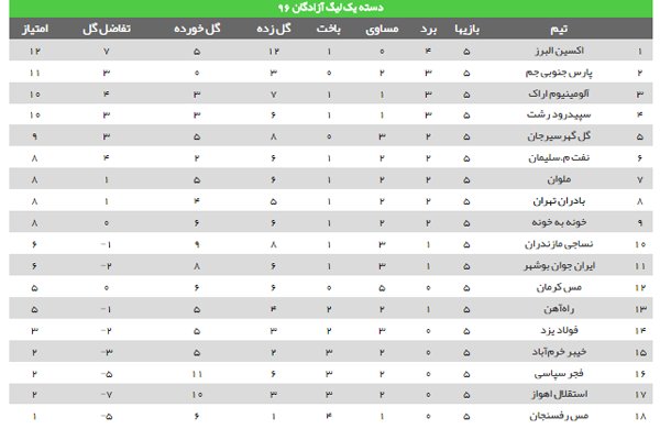 جدول رده بندی این مسابقات تا پایان هفته پنجم به شرح زیر است: