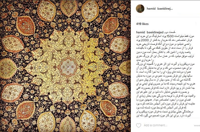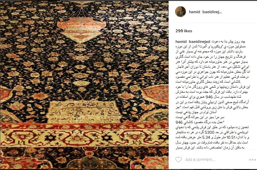 چند روز پیش بنا به دعوت مسئولین موزه ی "ویکتوریا و آلبرت" لندن از این موزه بازدید داشتم. این موزه که مجموعه ای بسیار غنی از فرهنگ و تاریخ جهان را در خود جای داده است گالری بسیار مهمی در هنر خاورمیانه هم دارد که بیشتر آنرا هنر ایرانی تشکیل می دهد، از هنر باستان تا دوران آخر قاجار. اما گُلِ بخش خاورمیانه که چون جواهری در این موزه می درخشد فرشی عظیم از هنر ناب ایرانی با طراحی مقصود کاشانی است که زینت بخش گالری خاورمیانه است.
