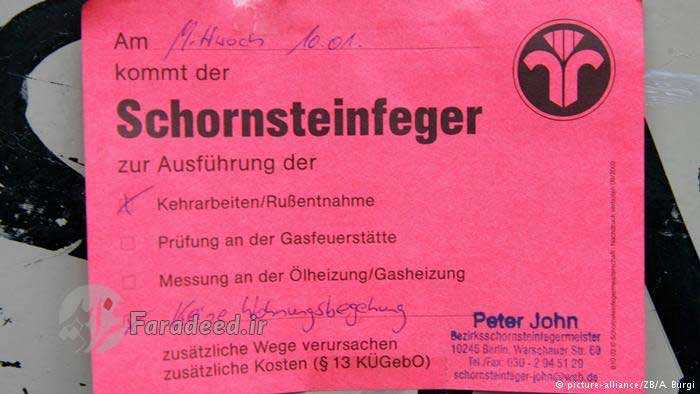 همه مردم ساکن آلمان سالی یکبار کارتی را از طرف شرکتهای دودکش پاککنی، که آنها را "شُورناشتاینفِگر" (Schornsteinfeger) مینامند، دریافت میکنند که در آن تاریخ و روز کنترل دستگاههای سوختی محل سکونتشان قید شده است.