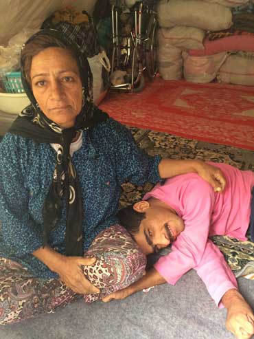 پس از خروج از این چادر، کمی آن طرف تر یک ویلچر باران خورده خود نمایی می کند. مشخص است که مدت زمان زیادی است که بیرون از چادر نگهدای شده است. ویلچری که نمایانگر حضور یک معلول در یکی از این چادرها است. سراغ او را که می گیرم زن ها نشانی آخرین چادر را به من می دهند. نامش «حسین» است و 25 سال دارد. معلول ذهنی و جسمی است و پدرش 10 سالی می شود که او را به همراه مادر رها کرده است.